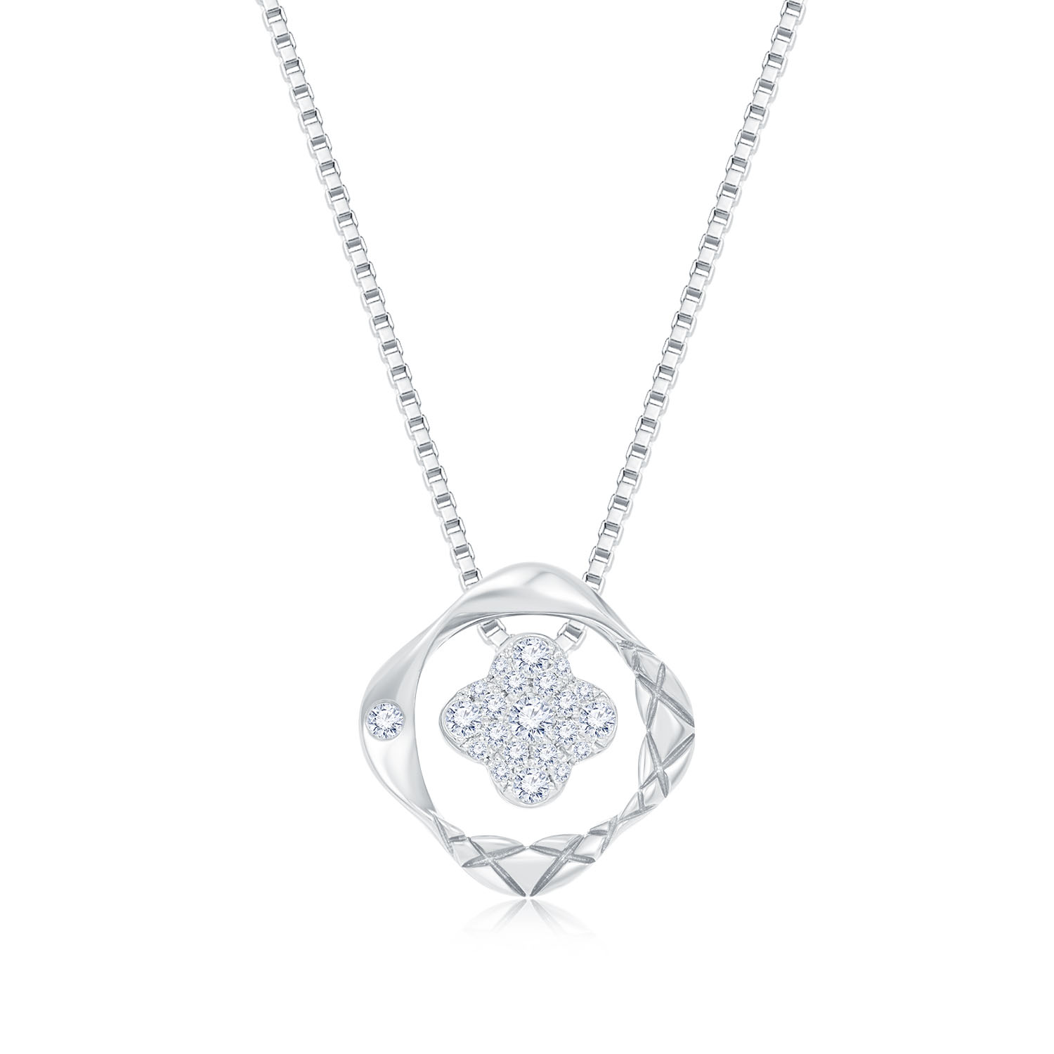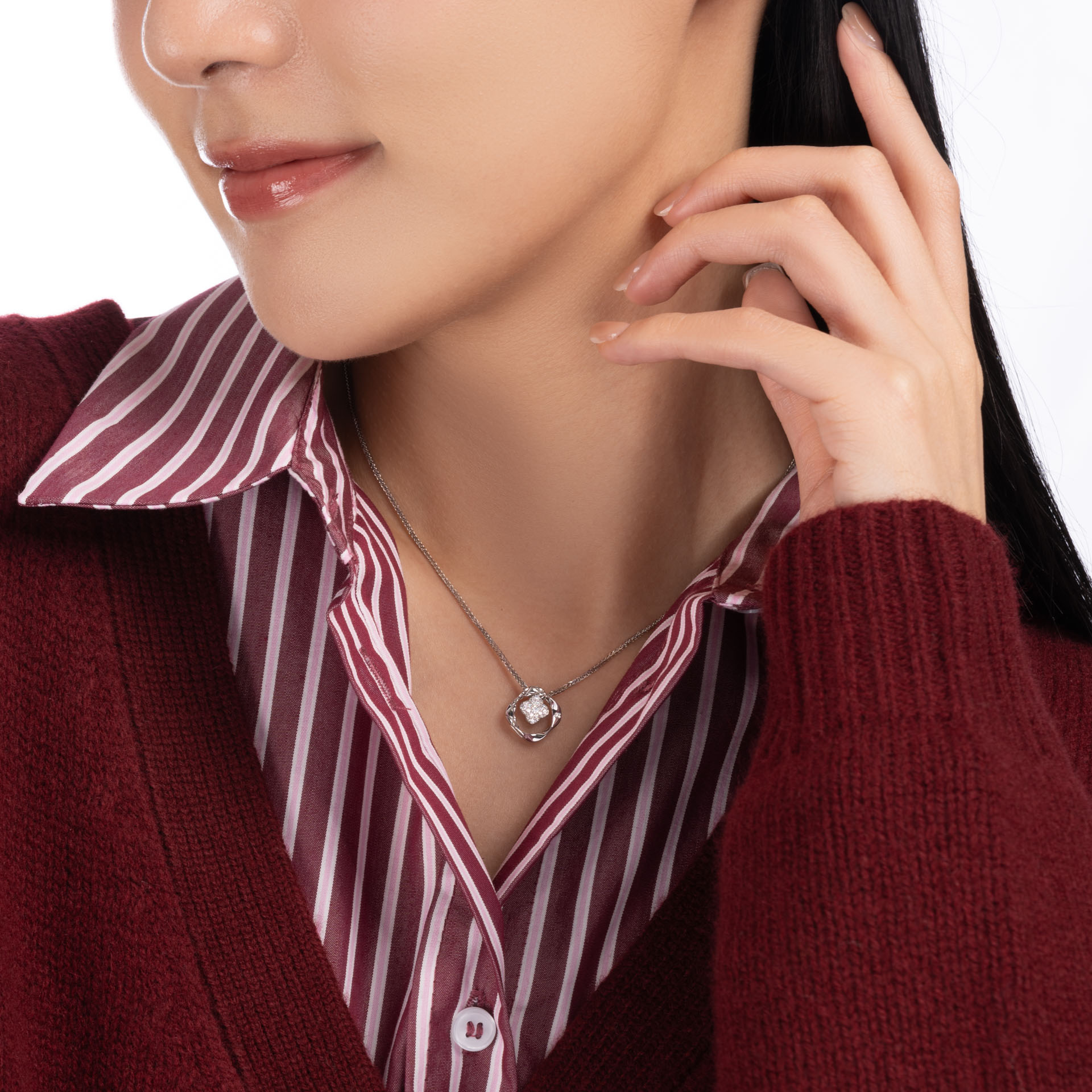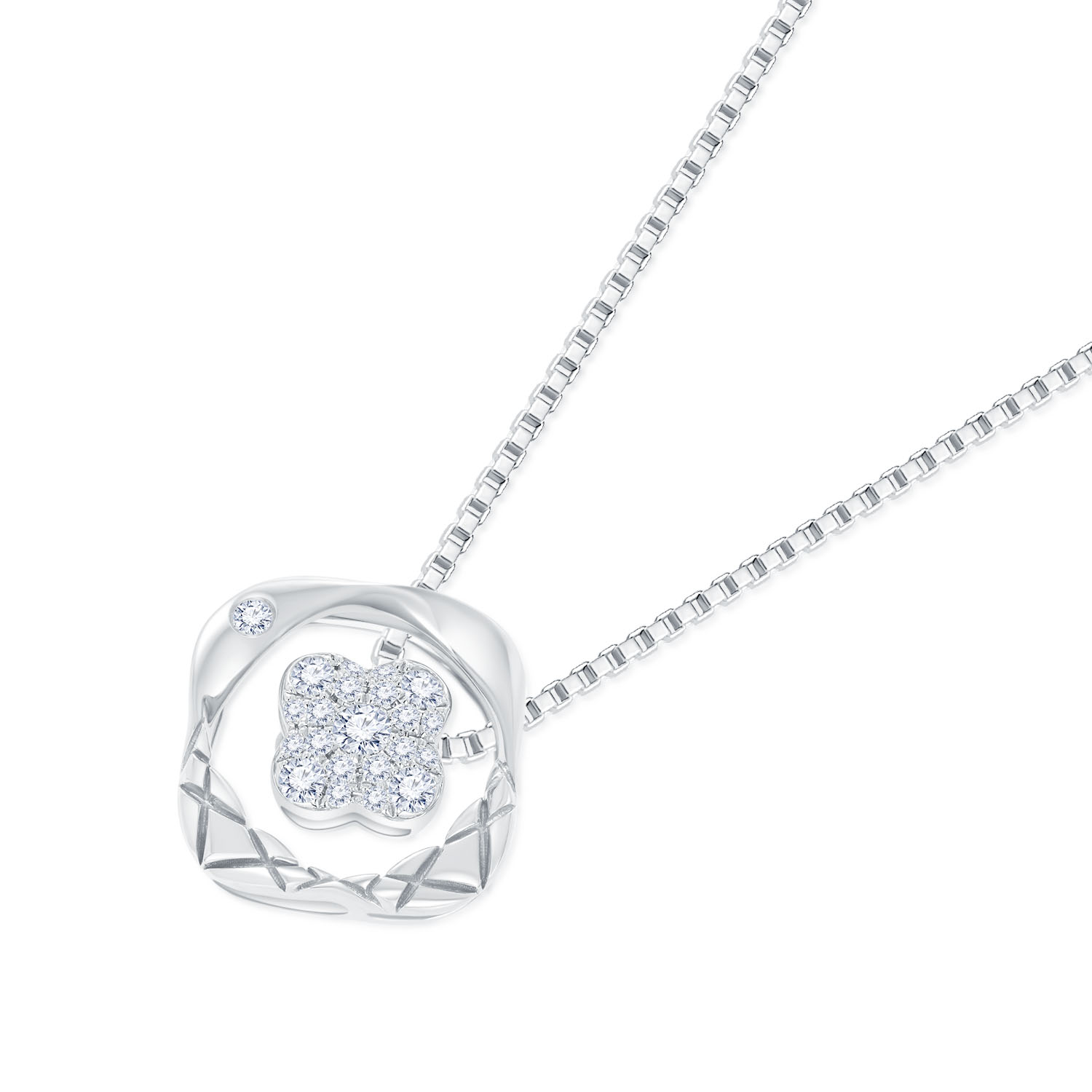 幸福家庭 — 將細水長流的愛化成堅固守護 環形設計包圍中心主鑽,有如天使之環守護所愛; 菱形吊墜以及中心花形吊墜可分拆獨立佩戴,適合不同場合及造型;圓形吊墜中心主鑽則可左右擺動,有如被捧在掌心、閃閃發亮的寶貝。