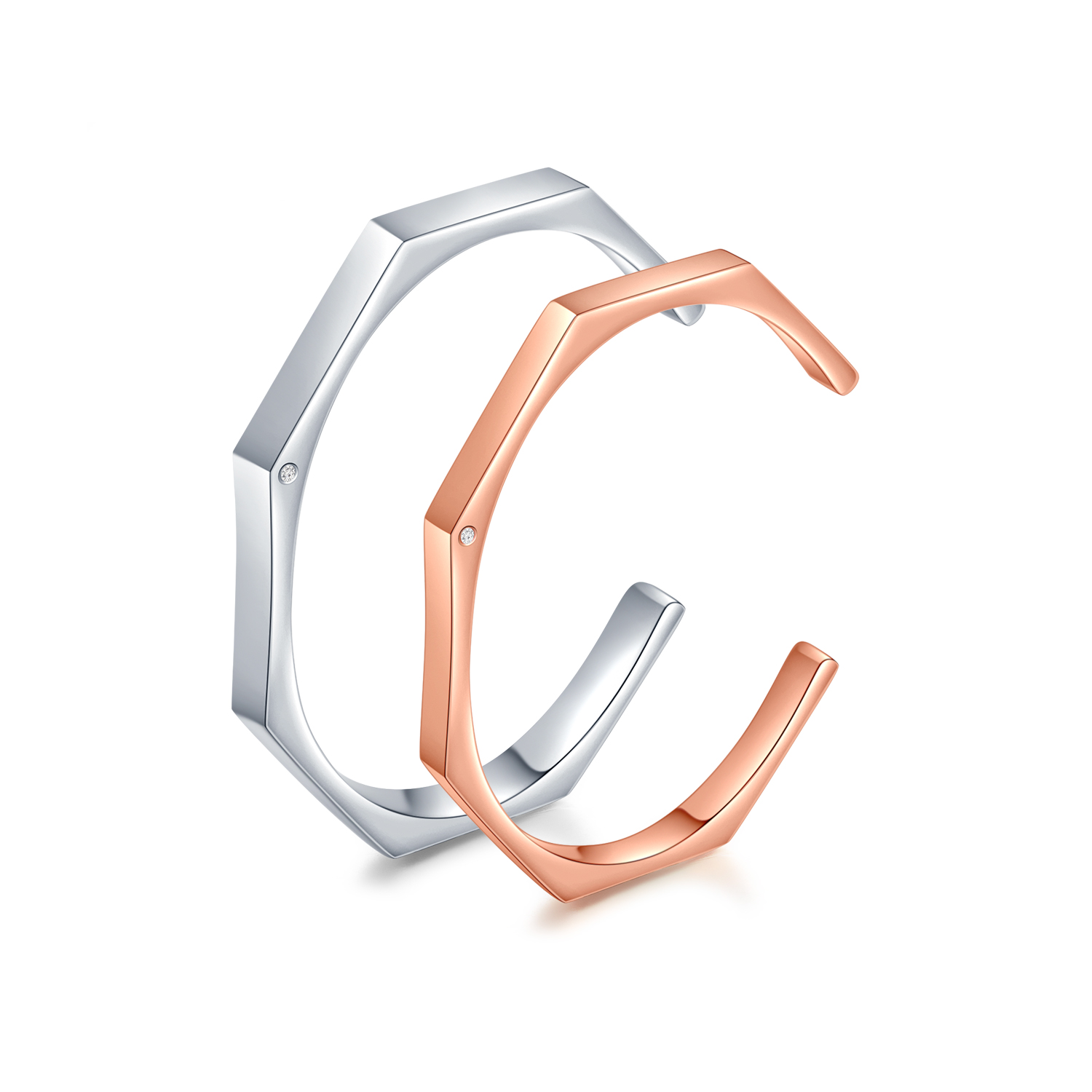 此款情侶手鐲以簡約六角設計,選用925純銀打造,男女手鐲分別側面鑲有精巧單顆鑽石。六角形擁有堅定穩固、平等和諧的意思,象徵平等相愛的戀人,一起並肩成長的愛情。